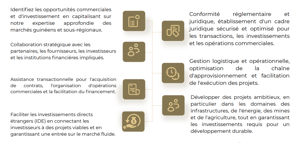 LHK GROUP est une entreprise stratégique basée en République de Guinée, spécialisée dans la facilitation des investissements, le développement de projets structurés et la diplomatie économique. Nous assistons les entreprises, les gouvernements et les institutions dans la conception, la structuration et la mise en œuvre de solutions durables qui répondent aux défis liés à la croissance, à l’innovation et à l’intégration économique en Afrique de l’Ouest. S’appuyant sur une expertise pluridisciplinaire et un large réseau de partenaires en Afrique, en Europe, en Asie et au Moyen-Orient, LHK GROUP se positionne en tant que catalyseur de transformation, facilitant les connexions entre les entités publiques et privées pour concrétiser les projets de demain.